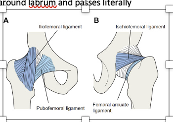 Joint capsule is attached around labrum and passes literally like a sleeve, to attach to the neck of the femur and then the capsule fibres turn back to attach to around the head of the femur. They hold down the arteries that run up from distal to proximal to supply most of the head of the femur.