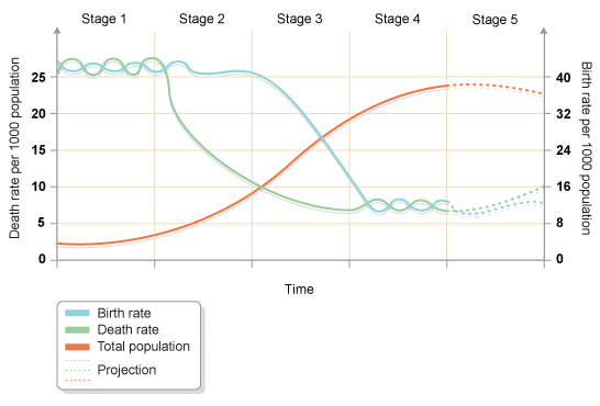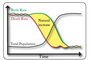 The DTM shows how changing birth and death rates affect the total population of a country.