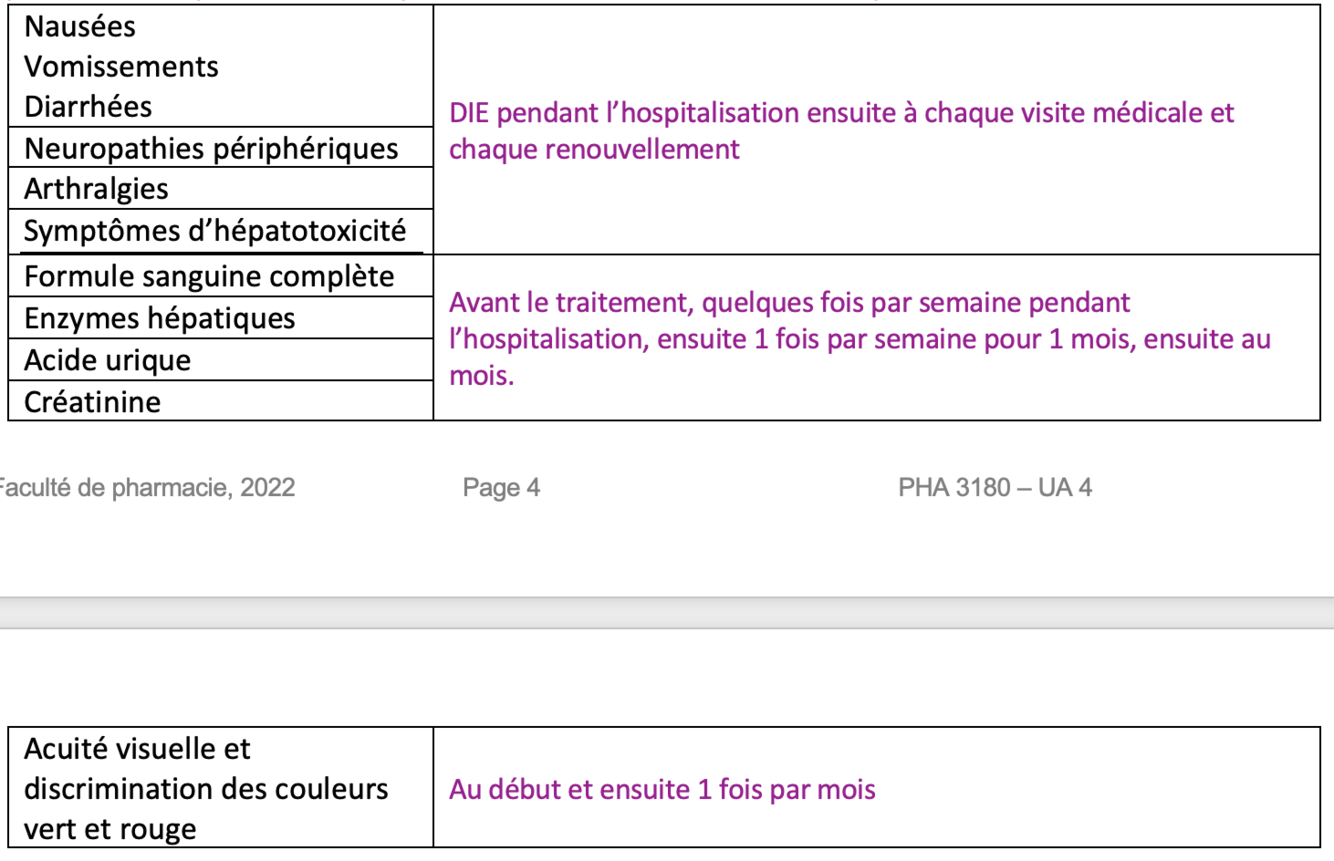 Fréquence de suivi pour les éléments suivants chez un patient sous antituberculeux