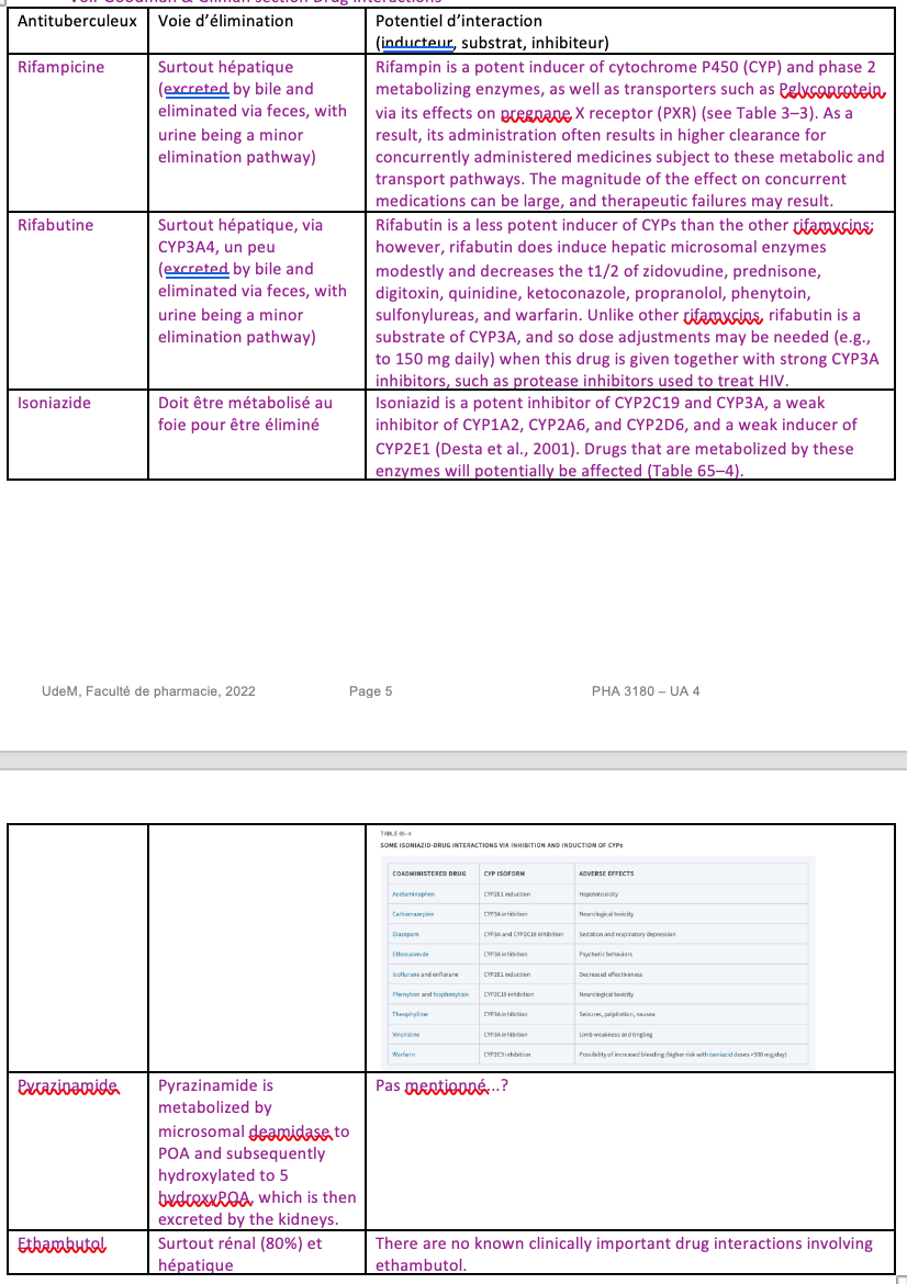 Pour chaque antituberculeux majeur, indiquez la voie d’élimination principale ainsi que le potentiel d’interaction, le cas échéant.