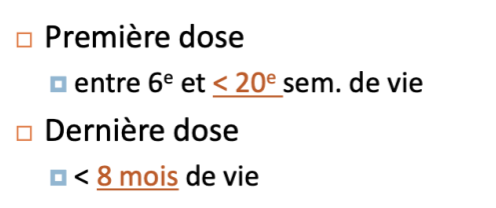 1e dose: doit absolument être entre 6-20e semaine de vie
