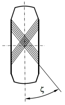 Reifen in Diagonalbauart haben symmetrisch gekreuzte Cordlagen, in der Skizze ist der Zenitwinkel eingetragen.