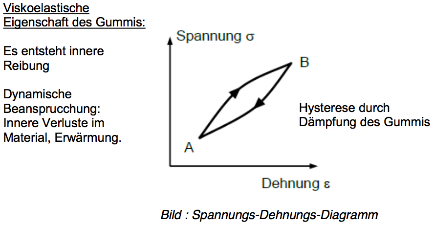Das Gummi des Reifens wird beim Durchlauf durch die Kontaktzone zwischen Reifen und Fahrbahn ständig deformiert. Das Gummi erfährt dabei Stauchungen bzw. Dehnungen und Normalspannungen. Diese Deformationen sind verlustbehaftet. Wie zeigt sich dieser Energieverlust in einem Spannungs-Dehnungsdiagramm? Zeichnen Sie hierzu eine Kennlinie, die den Zusammenhang zwischen Dehnung und Spannung angibt.