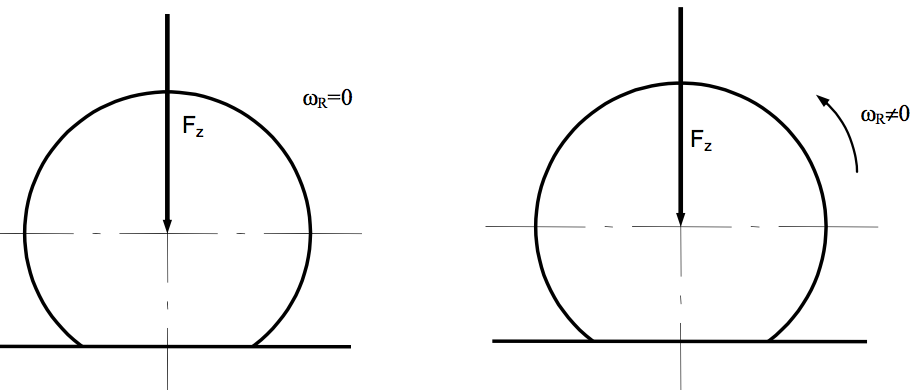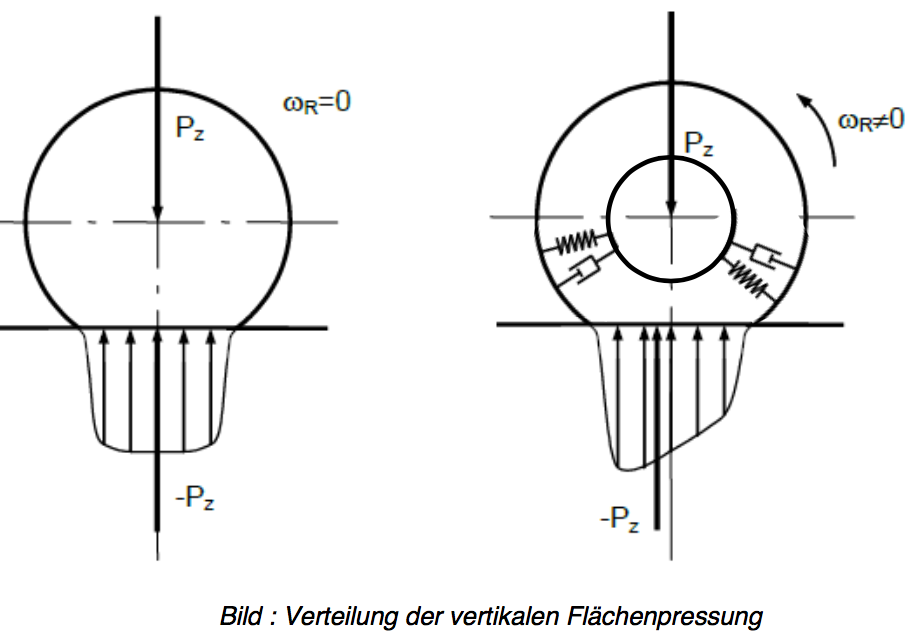 Skizzieren Sie die Verteilung der vertikalen Flächenpressung in der Aufstandsfläche des Reifens für ein stehendes und ein drehendes Rad. Warum ist die Flächenpressungs- verteilung im zweiten Fall anders?