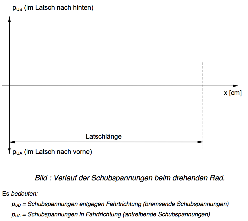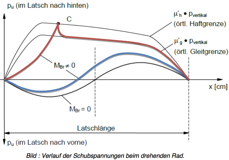 blau: Verlauf der Schubspannungen für ein schwach gebremstes Rad (es liegen praktisch noch keine Gleitungen vor).