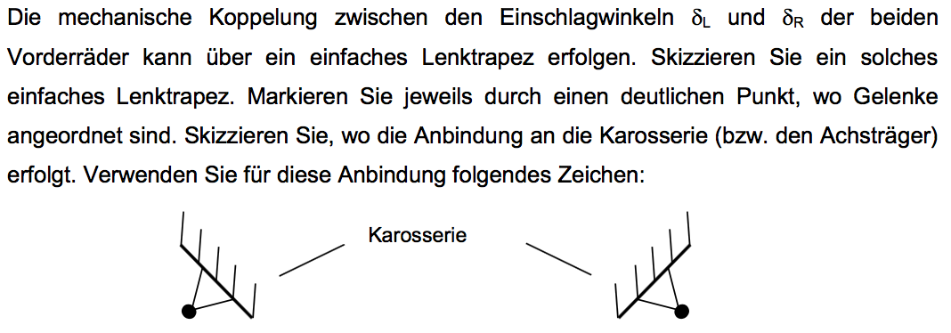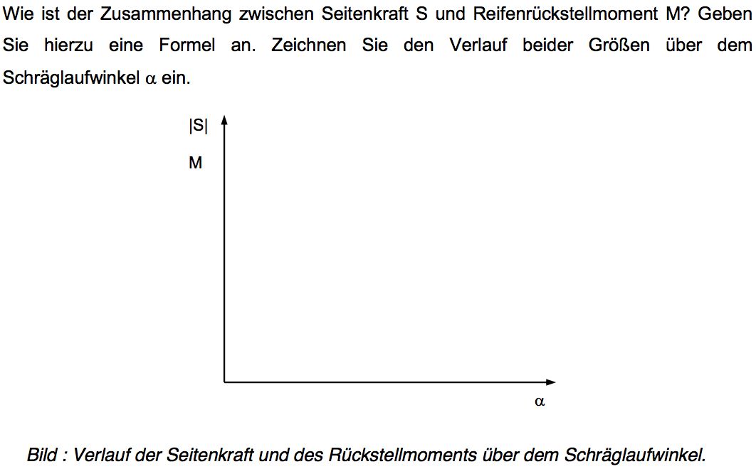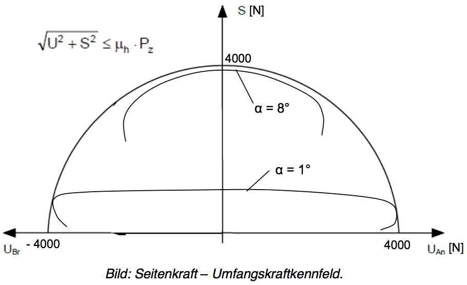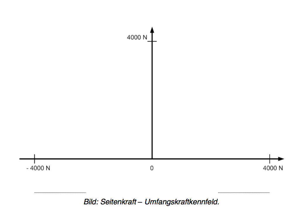 Nach der Kamm ́schen Reibungstheorie sind die maximal übertragbaren Umfangs- und Seitenkräfte durch eine Beziehung begrenzt. Geben Sie die Formel für diese Beziehung an. Tragen Sie für den Fall eines maximal übertragbaren Kraftbeiwert μh =1 und einer Vertikallast von 4000 N die größtmögliche Kraftresultierende als Hüllkurve in das folgende Diagramm ein. Zeichnen Sie beispielhaft eine Kennlinie für einen kleinen Schräglaufwinkel (1°) und eine Kennlinie für einen großen Schräglaufwinkel (8°) ein. Beschriften Sie die Achsen und benennen Sie die Kurven.