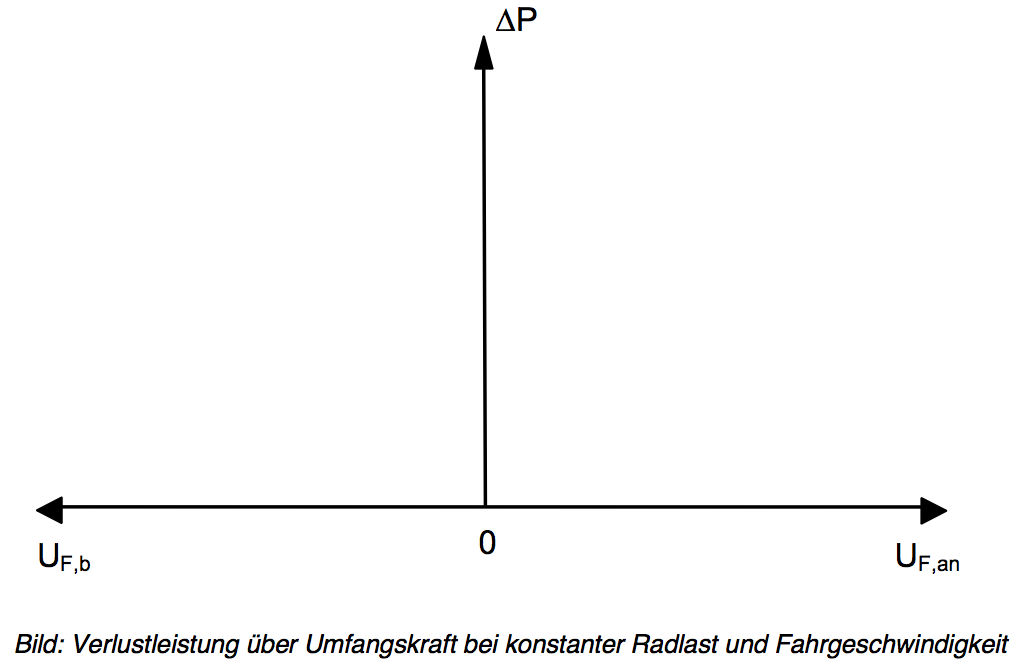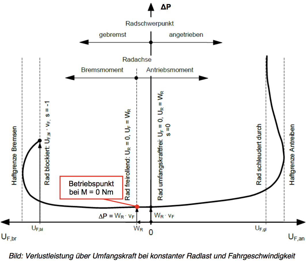 Skizzieren Sie den Verlauf der Verlustleistung am Reifen deltaP über der Umfangskraft UF bei konstanter Radlast und Fahrgeschwindigkeit. Kennzeichnen Sie die wichtigen Grenzen, Betriebszustände und -bereiche. In welchem Betriebspunkt befindet sich ein Rad, wenn es sich im nicht angetriebenen Zustand (Antriebsmoment M = 0 Nm) befindet? Kennzeichnen Sie diesen Punkt. Wie kann die Verlustleistung in diesem Punkt berechnet werden?