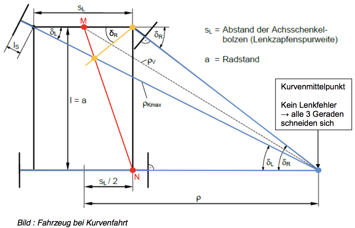 Konstruieren Sie den relevanten Schnittpunkt, der sich durch die Radeinschlag-Verhältnisse im obigen Bild ergibt. Es soll kein Lenkfehler vorliegen.
