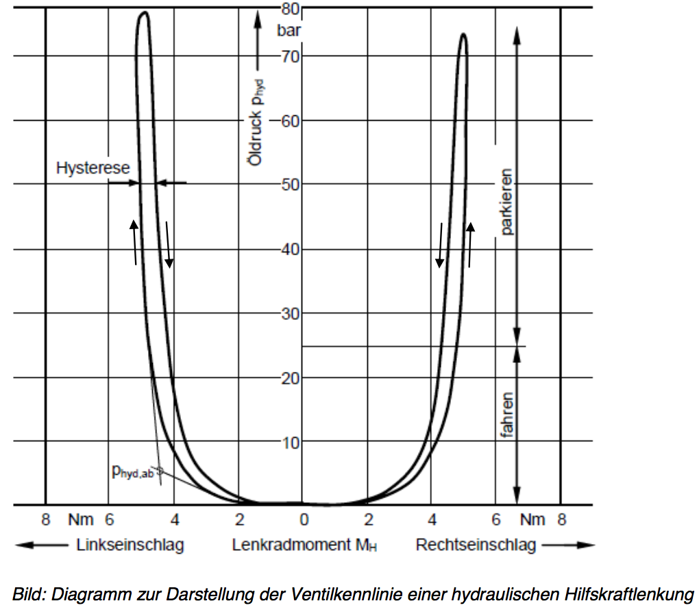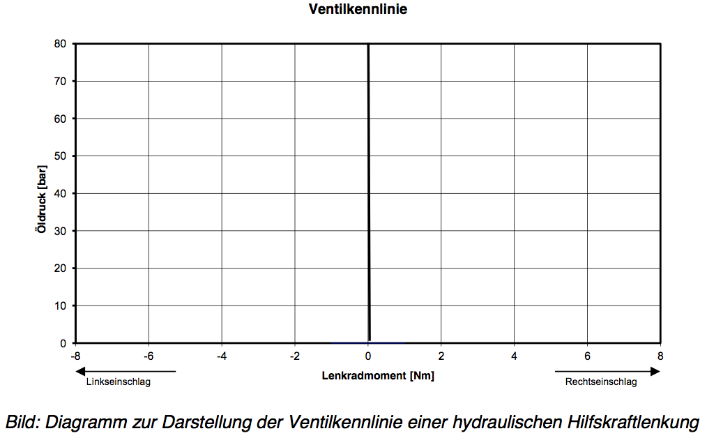 Tragen Sie im nachfolgenden Bild den typischen Verlauf einer Ventilkennlinie einer normalen hydraulischen Hilfskraftlenkung ein. Kennzeichnen Sie im Diagramm die Bereiche, in denen sich die Drücke beim Fahren und Parkieren bewegen.