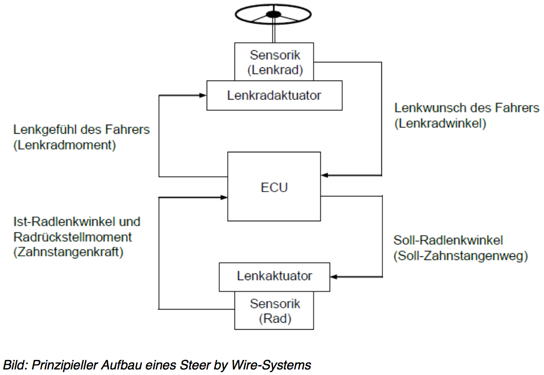 Skizzieren Sie den prinzipiellen Aufbau eines Steer-by-Wire-Systems. Tragen Sie in entsprechende Kästchen die Bezeichnung der erforderlichen Komponenten ein. Kennzeichnen Sie durch Pfeile den Datenfluss zwischen den einzelnen Komponenten. Erläutern Sie kurz die Funktion aller relevanten Einzelteile.