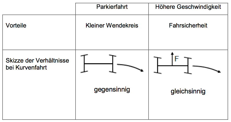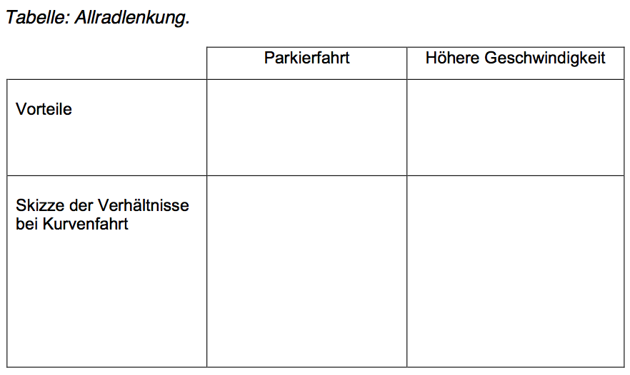 Nennen Sie in folgender Tabelle die Vorteile einer Allradlenkung. Unterscheiden Sie hierzu eine Parkierfahrt und eine Fahrt mit höherer Geschwindigkeit. Machen Sie außerdem eine Skizze, wie die Räder (vorne und hinten) bei Kurvenfahrt eingeschlagen werden.