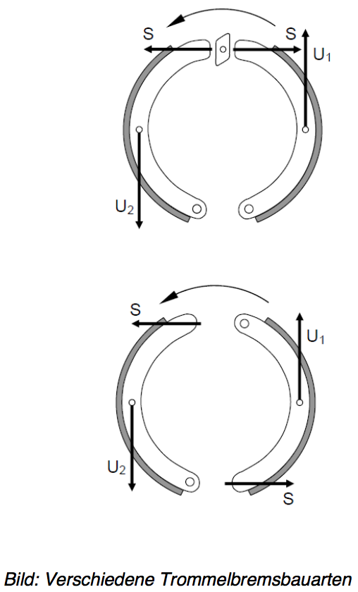 Welche Trommelbremsenbauarten sind in den folgenden Abbildungen dargestellt? Handelt es sich bei den dargestellten Bremsbacken um auflaufende oder ablaufende Bremsbacken (die Drehrichtung der Trommel ist jeweils eingetragen)? Beschriften Sie die Bremsbacken in den Abbildungen.