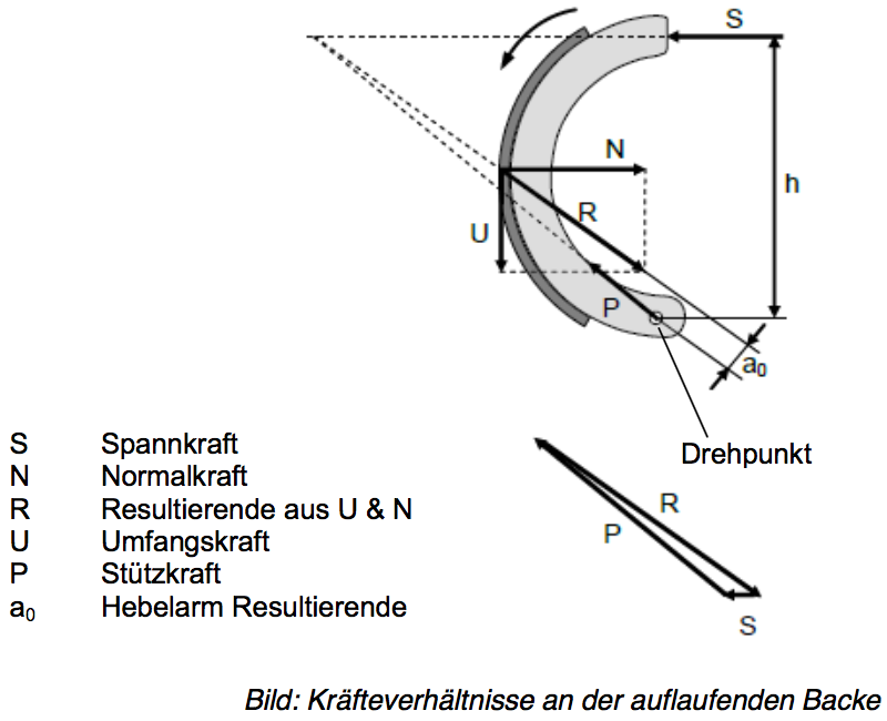 Skizzieren Sie eine auflaufende Bremsbacke einer Trommelbremse. Zeichnen Sie alle Kräfte für den Fall ein, dass keine Selbsthemmung auftritt.