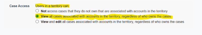 Answer : Set sharing for cases to Private In the Territory Model, set Case Access to “View”