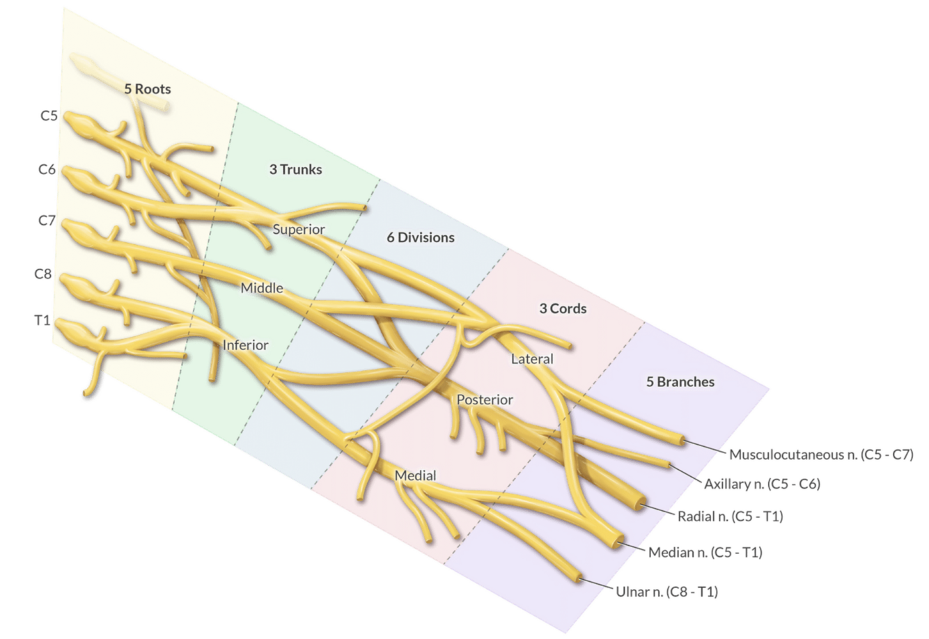 originate from union of ventral rami of C5-T1 spinal nerves. roots pass between anterior and middle scalene muscles