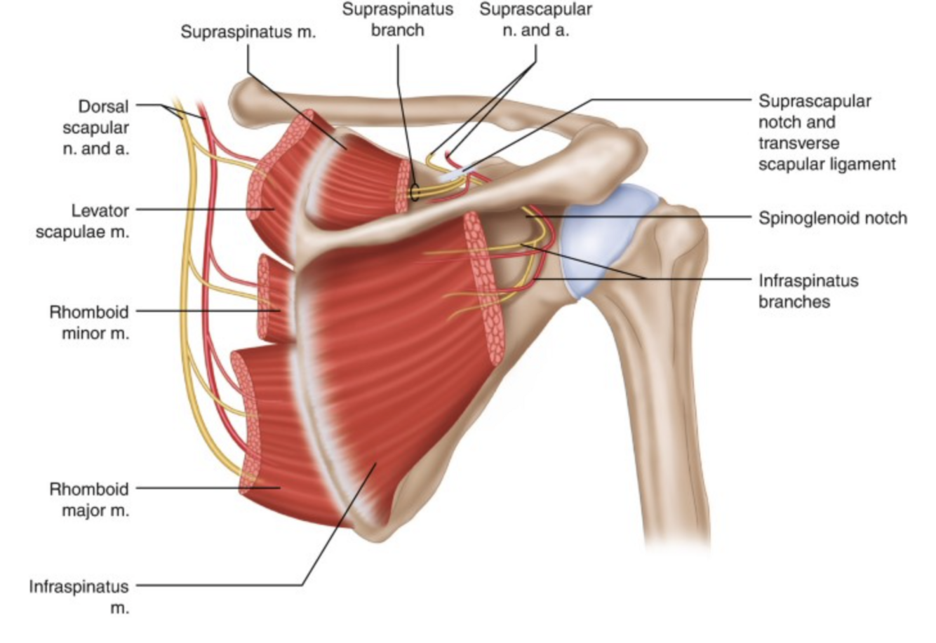 comes off C5-6, innervates supraspinatus and infraspinatus muscles, as well as posterior glenohumeral joint, subacromial bursa, acromioclavicular joint
