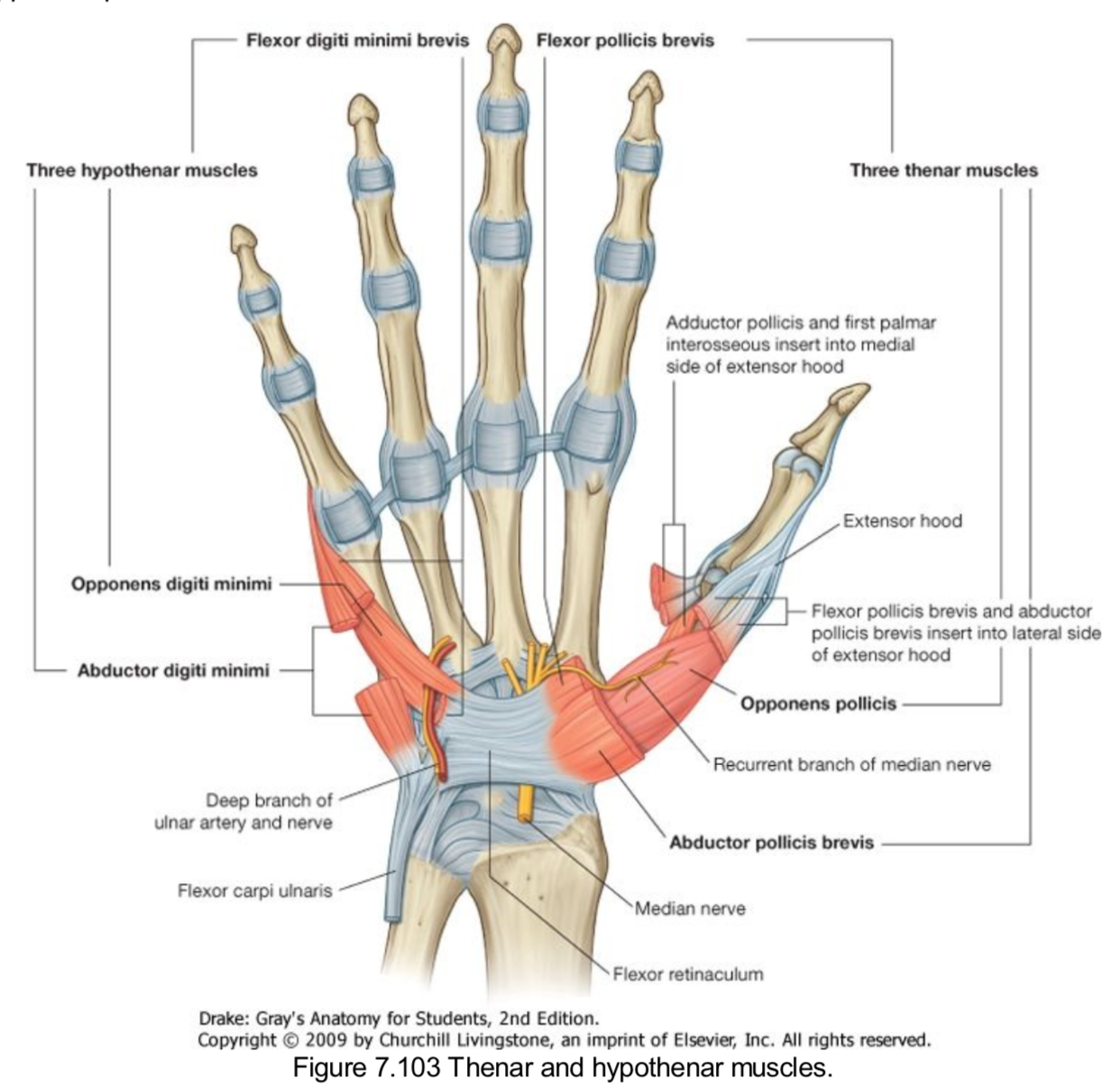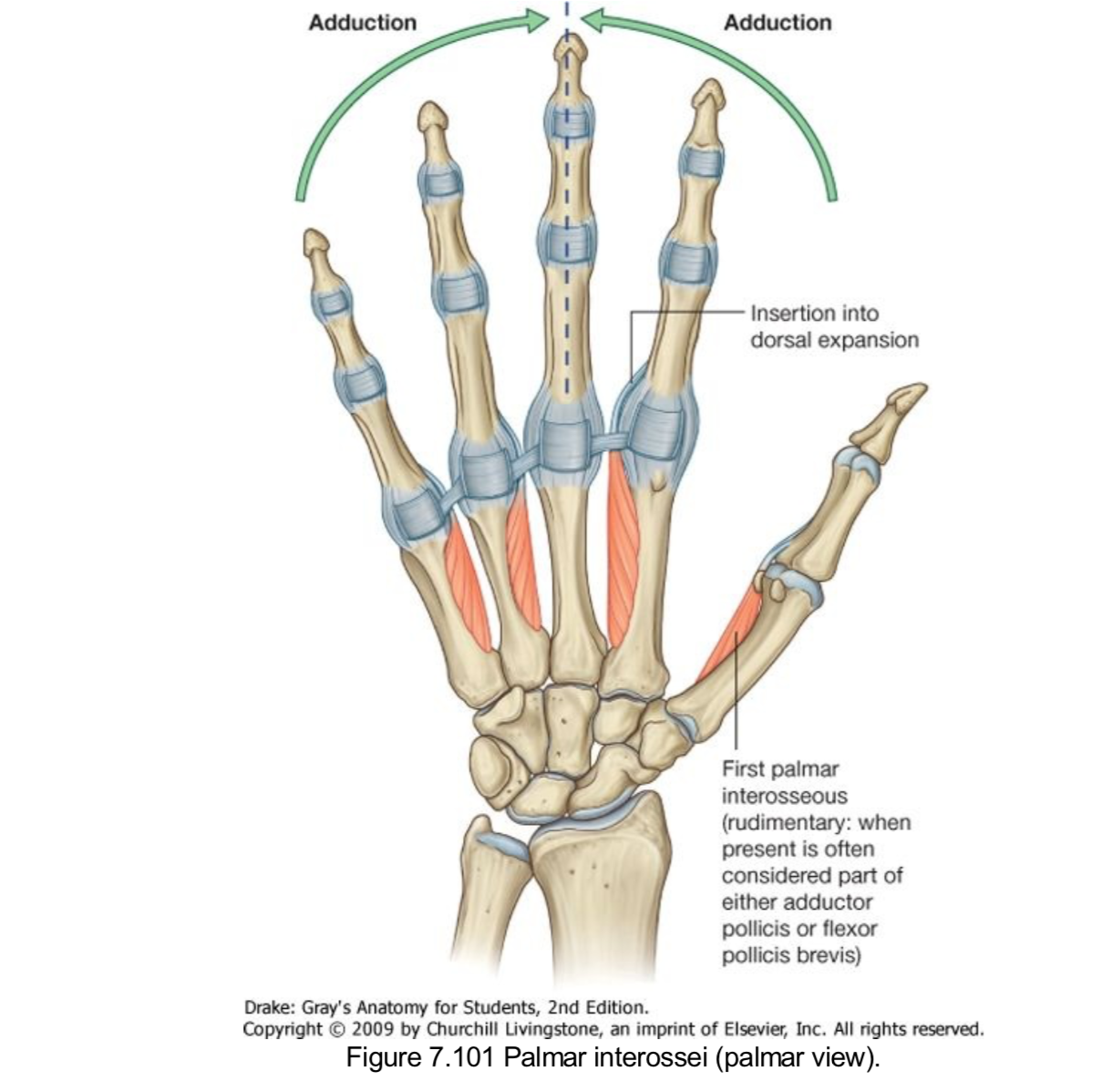 Side of metacarpals to extensor hoods and proximal phalanx of thumb