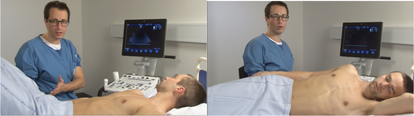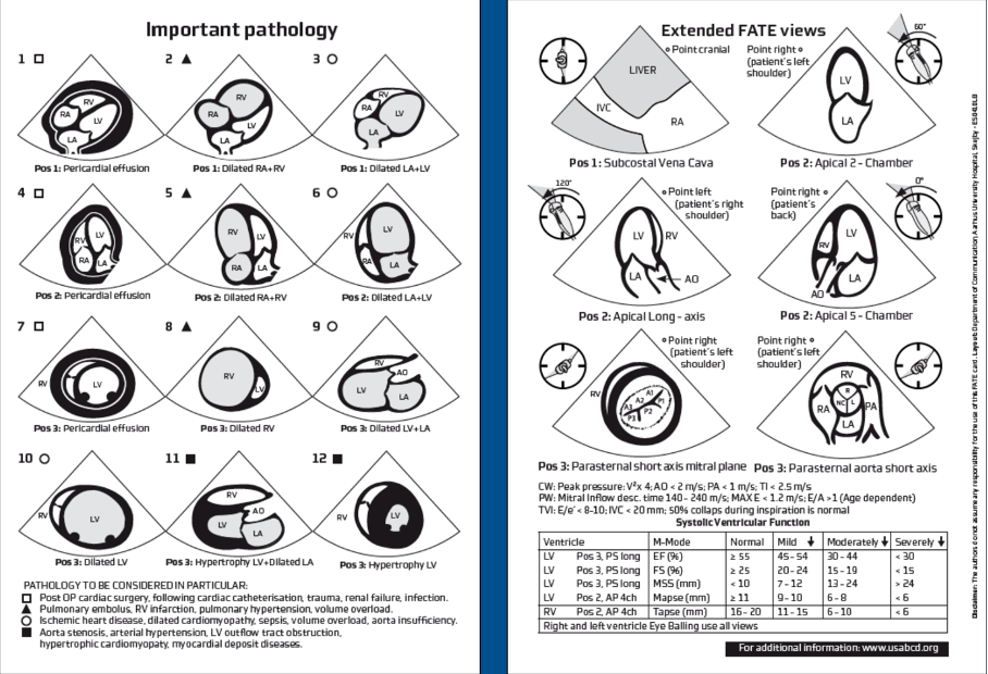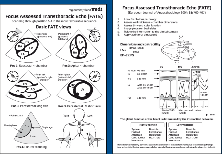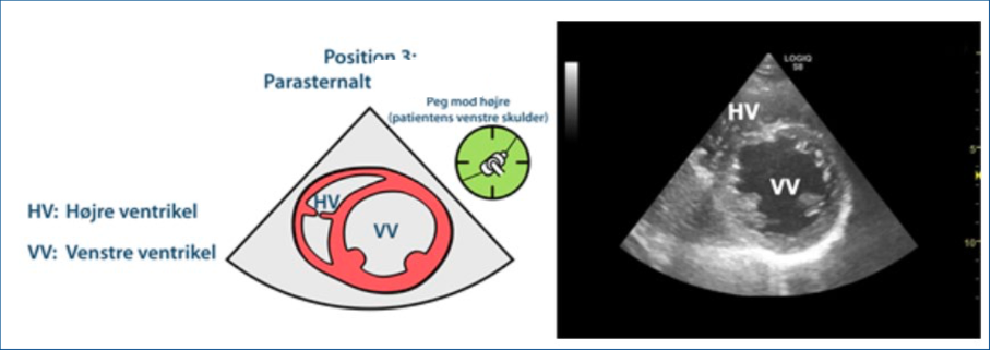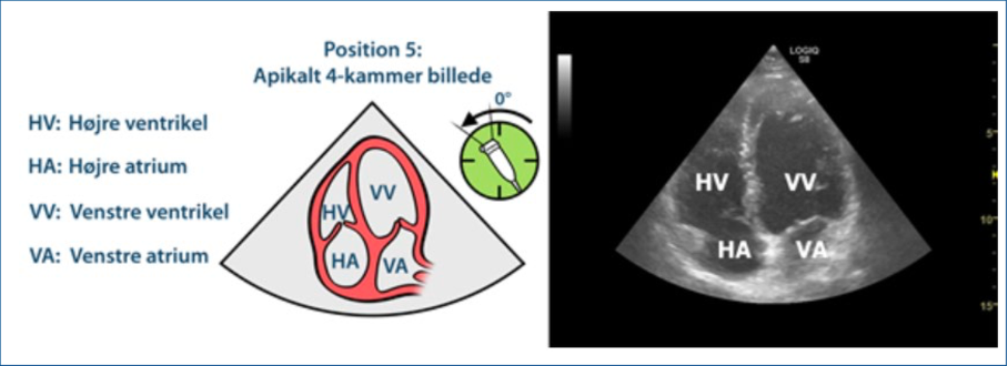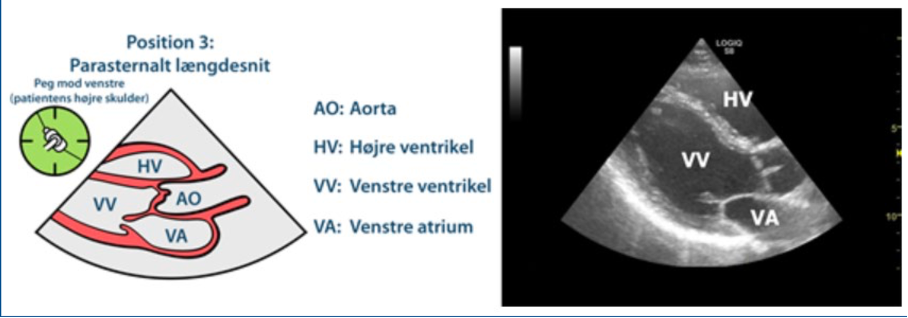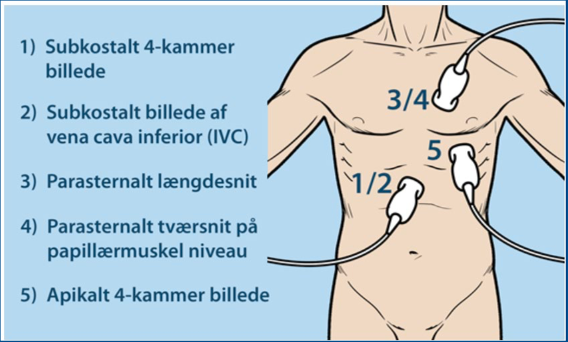 3) Parasternalt længdesnit + 4) Parasternalt tværsnit + 5) Apikalt 4-kammer billede: for optimalt billede skal patienten ligge på 2