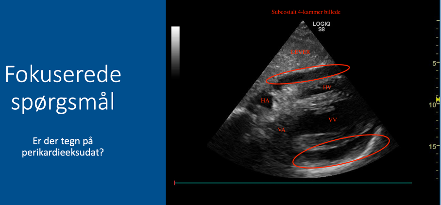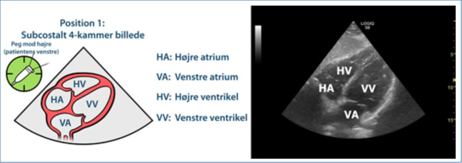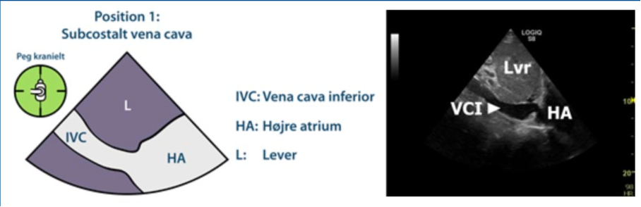 1) Subcostalt 4-kammer billede + 2) Subcostalt billede af IVC: for optimalt billede skal patienten ligge på 1