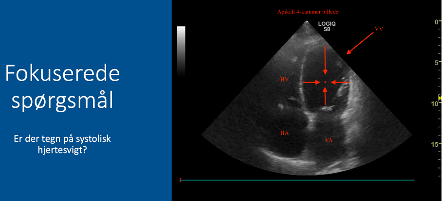 * Hvis NEJ (væggene bevæger sig ikke ind mod midten, eller bevægelsen er sløv): tegn på systolisk hjertesvigt / nedsat EF (ejektionsfraktion)