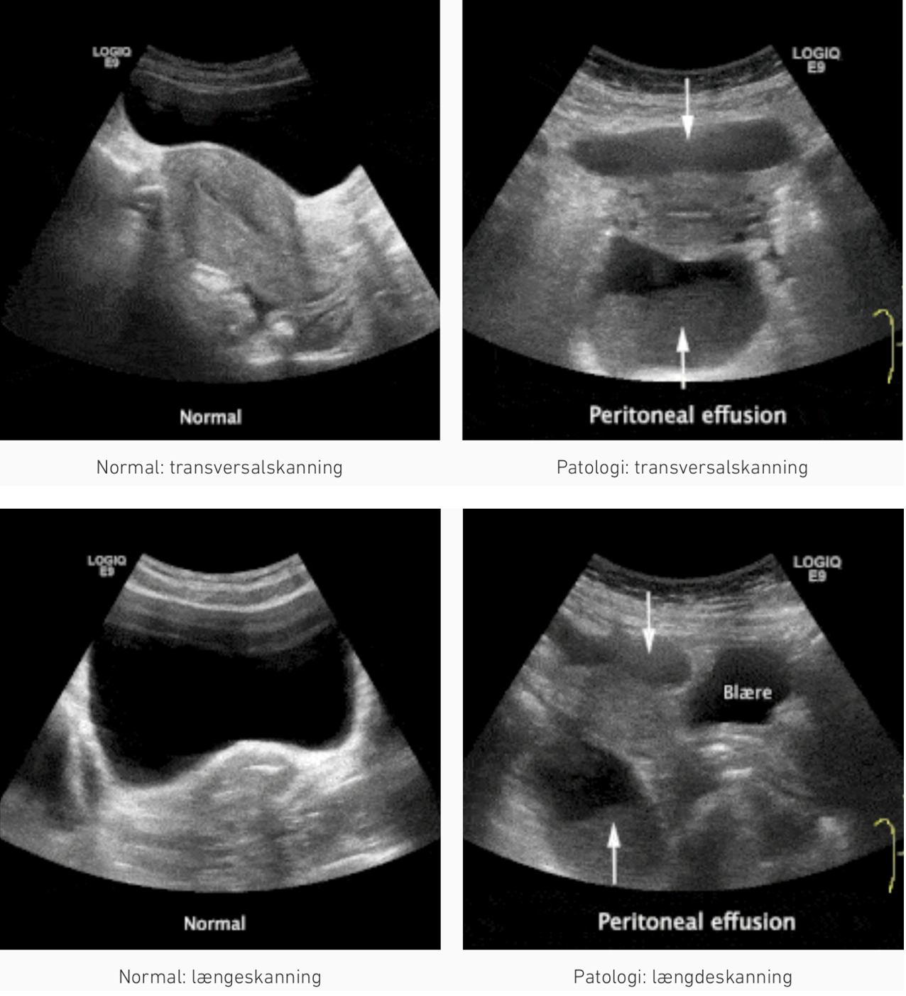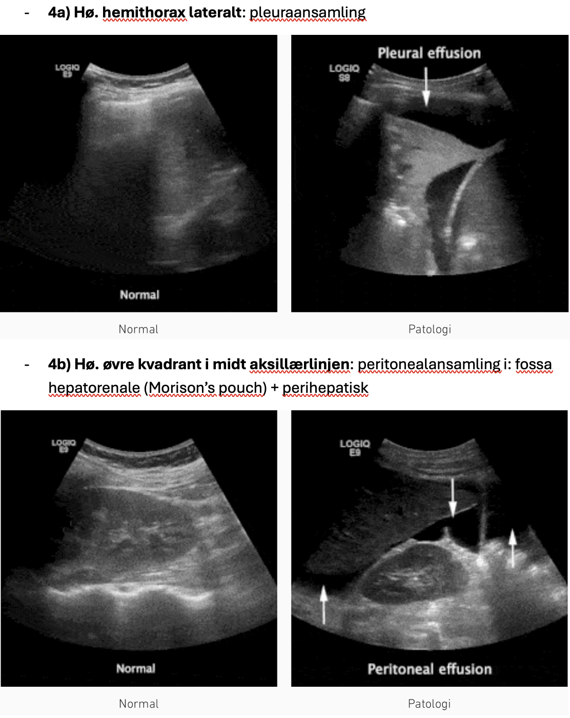 - 4b) Hø. øvre kvadrant i midt aksillærlinjen: peritonealansamling i: fossa hepatorenale (Morison’s pouch) + perihepatisk