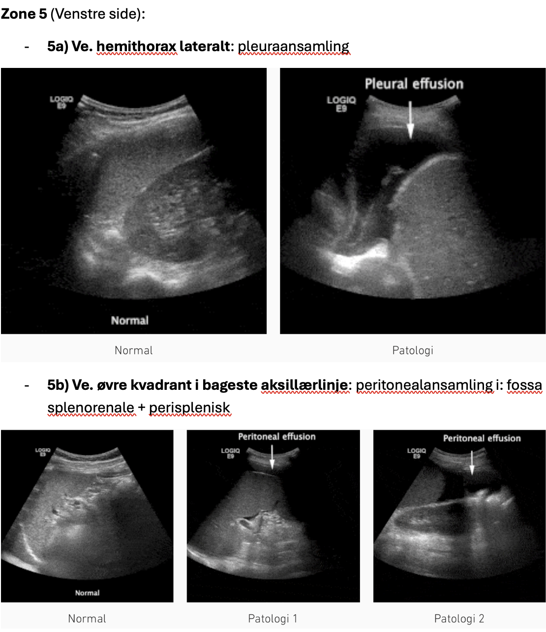 - 5b) Ve. øvre kvadrant i bageste aksillærlinje: peritonealansamling i: fossa splenorenale + perisplenisk
