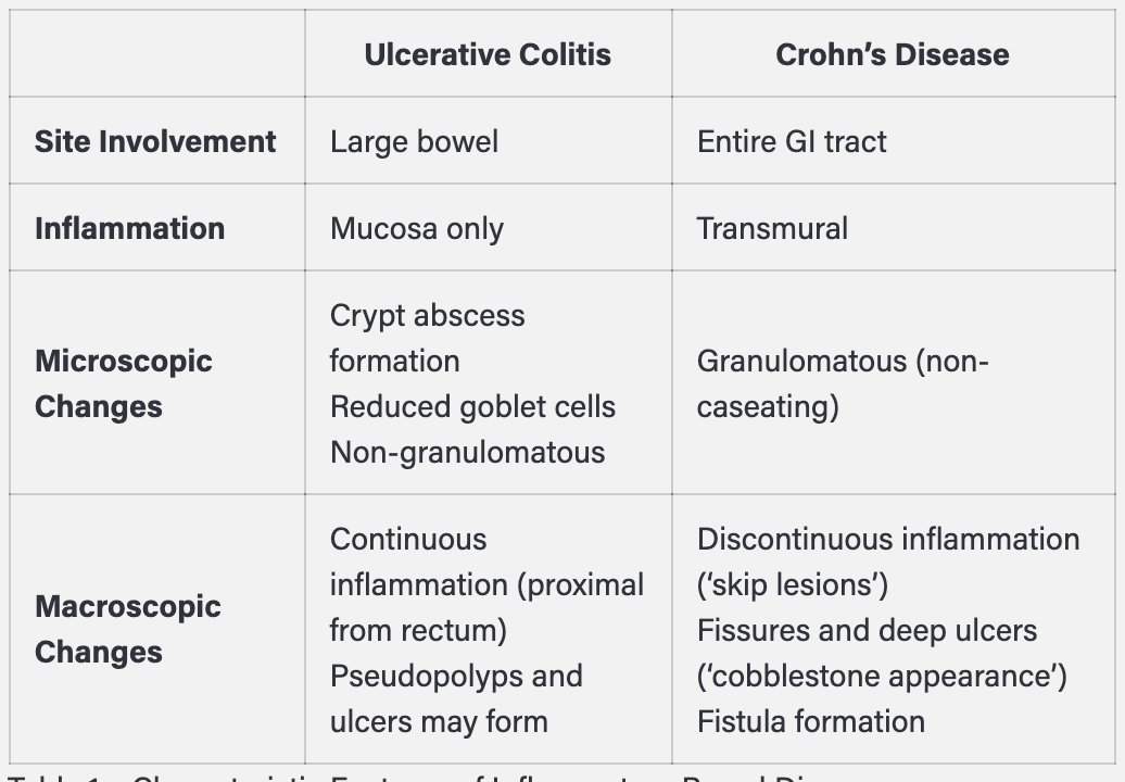 Describe the differences between UC and Crohns?