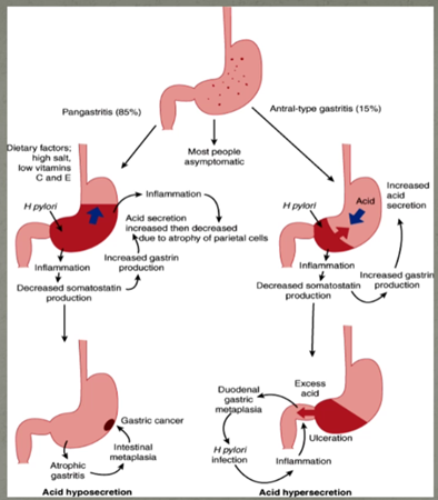 Så det höjt pH vid Helicobacterinfektion leder till gastrinfrisättning, vad leder det till?