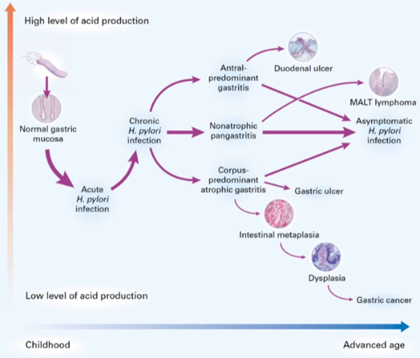 Vilka tre vägar kan en infektion av Helicobacter pylori ta och vad avgör delvis vägarna?