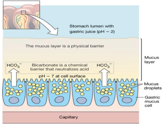 Genom ytepitelets gastriska körtlars sekretion av slem (bildar lager) och HCO3-