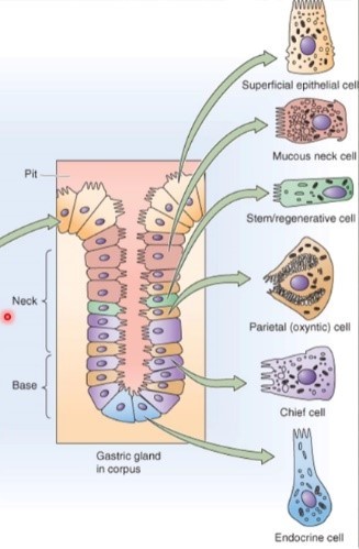 Vilka typer av sekrerande celler finns i körtlar i corpus och fundus?