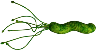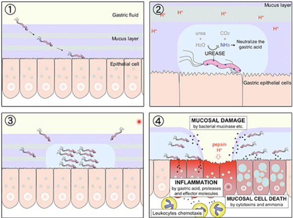 Koloniserar ytepitel vartefter Helicobacter genom ureas bryter urea och bildar ammoniak (NH3) och CO2 i slemhinnan vilket binder H+ till ammonium (NH4) i slemhinnan och höjer pH lokalt vilket gör att de kan överleva (mikromiljö)