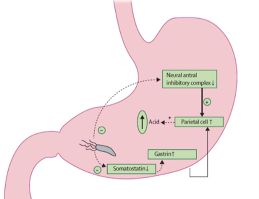 Så det höjt pH vid Helicobacterinfektion leder till gastrinfrisättning, vad leder det till?