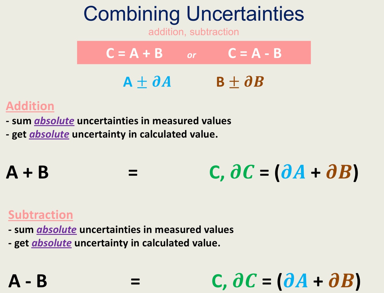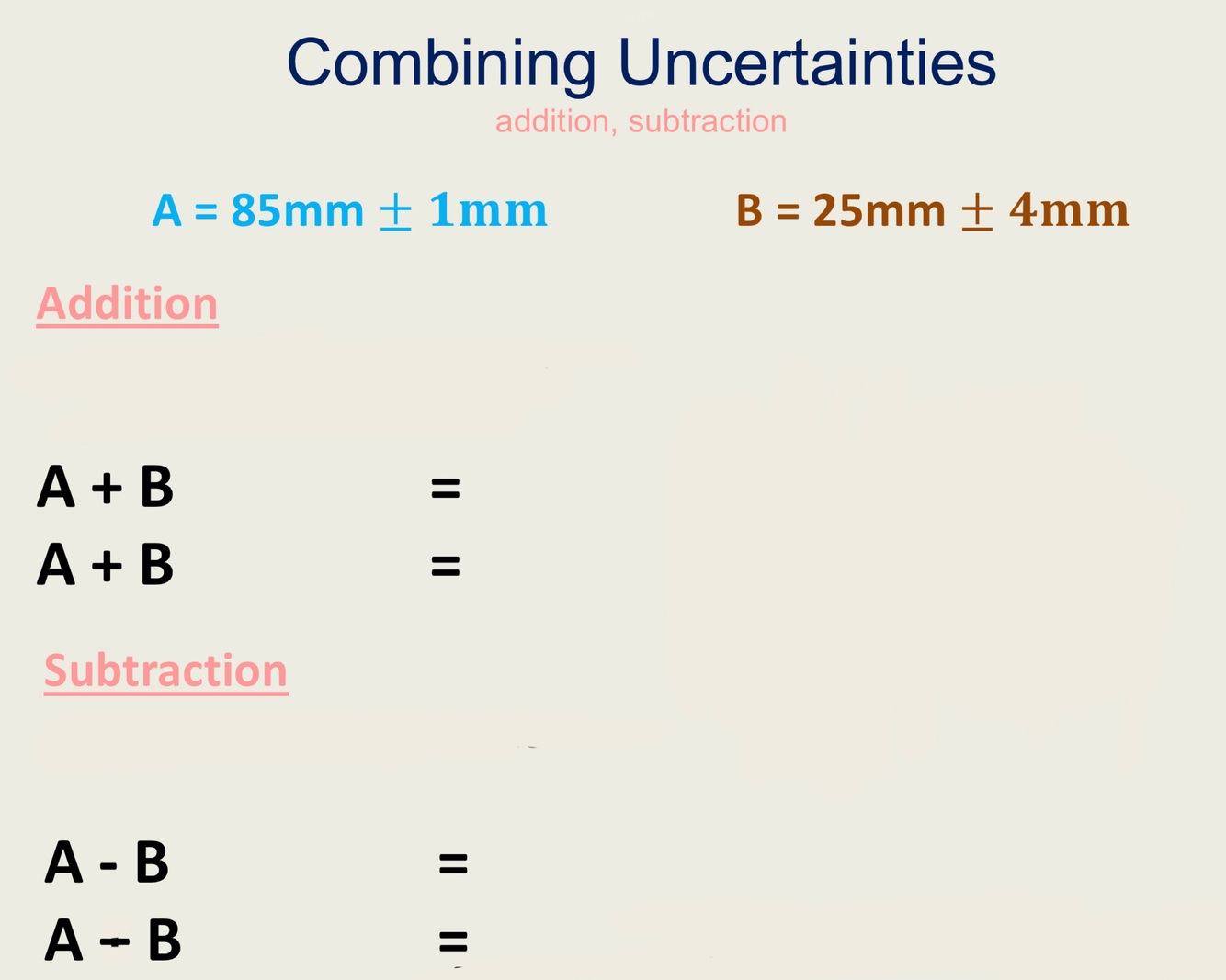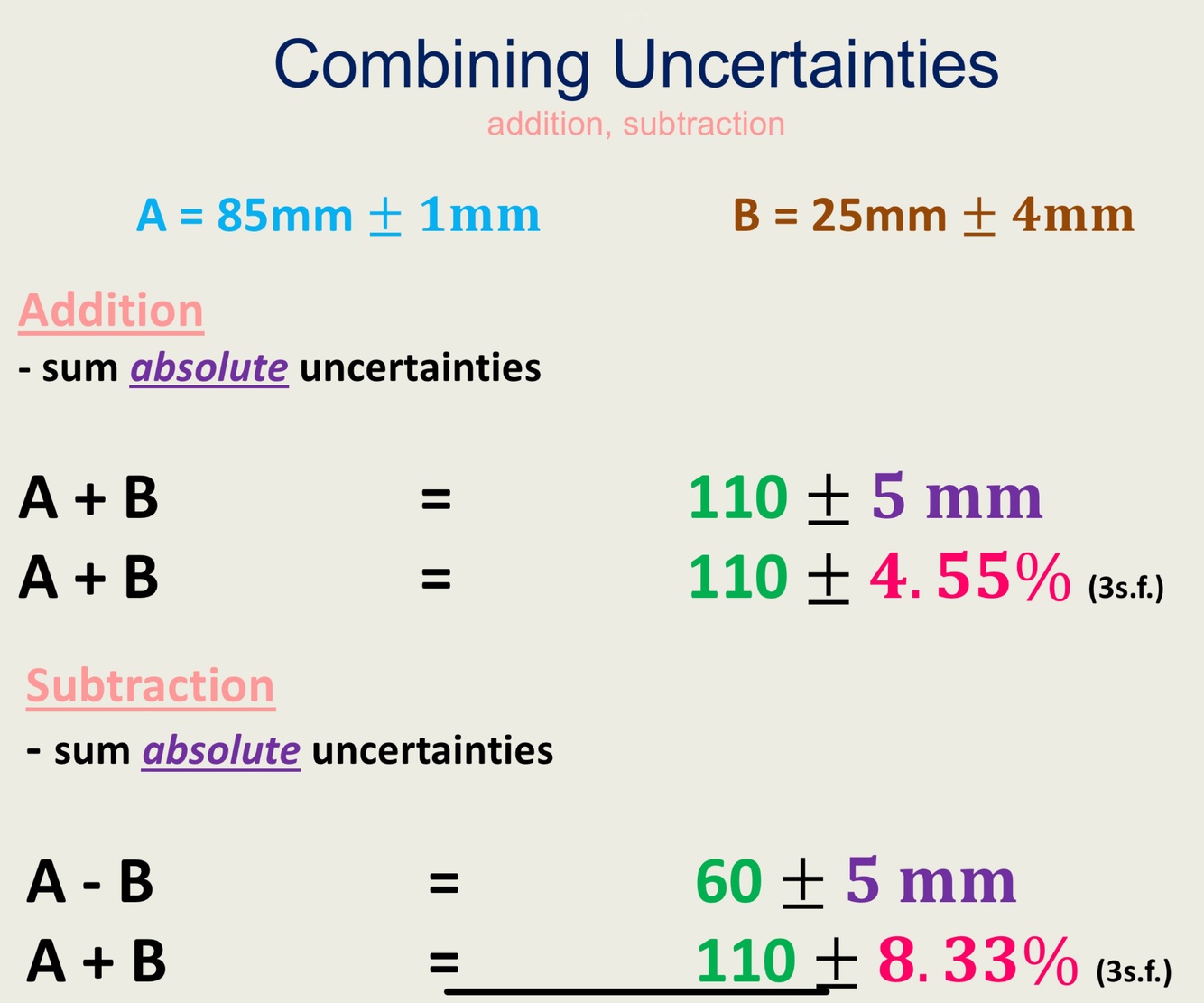 Calculate the absolute uncertainty and percentage uncertainty of A+B and A-B ?