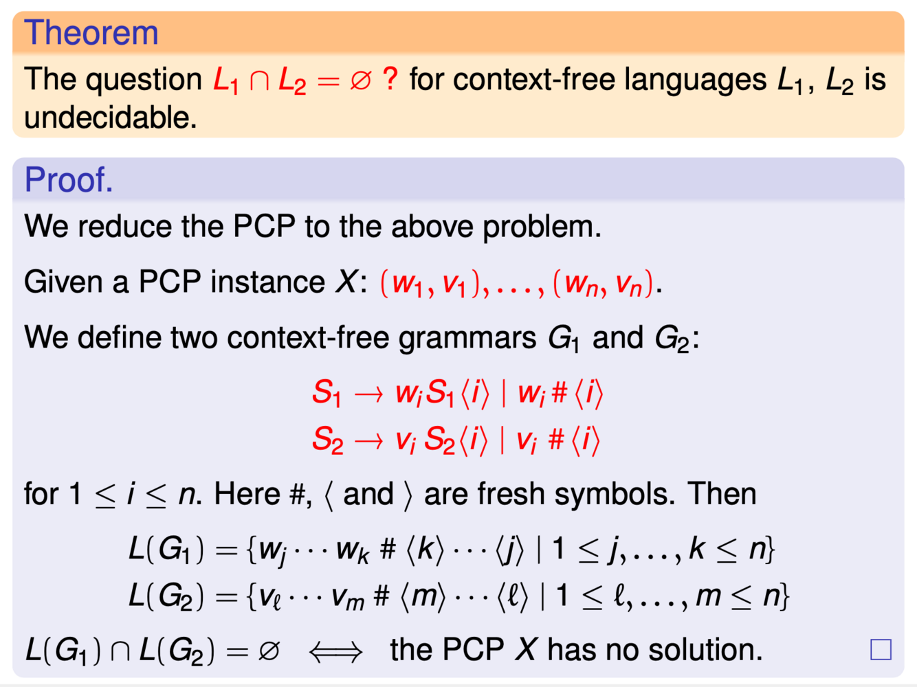 Proof that it is undecidable if the intersection of two languages is the empty set.