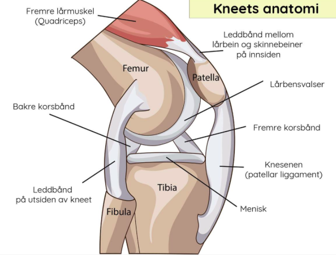 Hvilke kliniske funn er typiske ved kneskade, og kan du beskrive hovedtrekkene i anatomien i kneleddet?