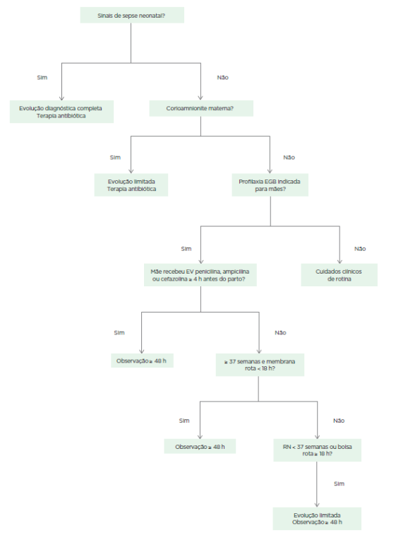 Fluxograma para sepse neonatal - pontos importantes (4), fluxograma completo e quais germes são mais comuns (2)