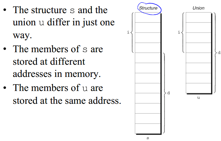 How do struct and Union differ in memory? Draw it.
