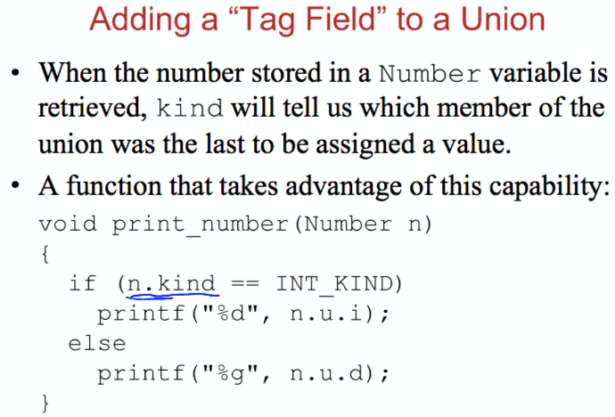 After the pictured code, each time we assign a value to a member of u, we’ll also change kind to remind us which member of u we modified.