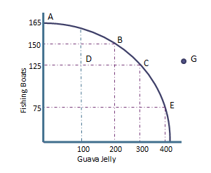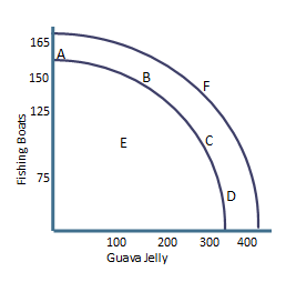 According to the production possibilities curve above, if the economy moves from point B to point E, the opportunity cost of each additional guava jelly