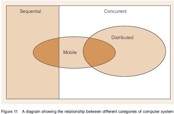In this interpretation, the sets for sequential and concurrent systems have no overlap. All distributed systems are (potentially) concurrent, and mobile systems may be distributed or could be independent (like a PDA). These independent mobile systems might or might not be capable of concurrency depending on their hardware and software design, although most such systems are likely to be concurrent nowadays. Our diagram is shown in Figure 11 – the size of the shapes and the size of their overlap is not significant.