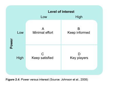 Explain Johnson (2008) stakeholder analysis - POWER vs. INTEREST