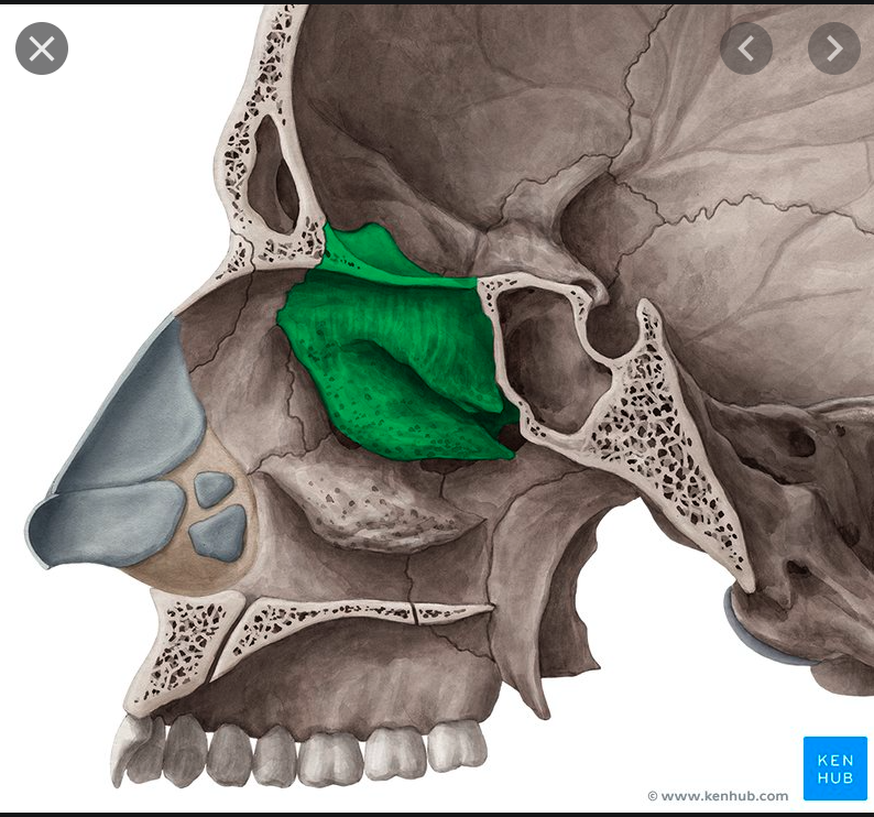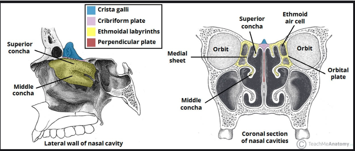 cribriform plate with the crista galli, perpendicular plate superior and middle conchae, ethmoidal air cells