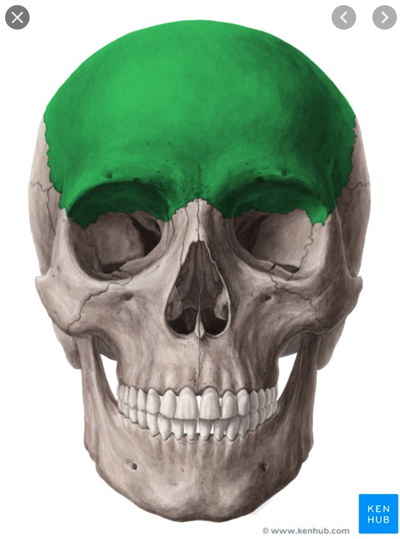 contains air sinuses; in two parts at birth but usually fuses early in life superior ciliary ridges and supra-orbital notches