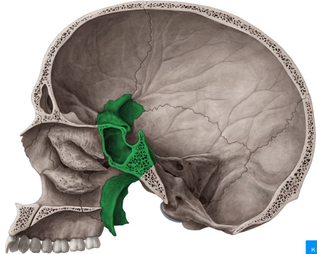greater and lesser wings, medial and lateral pterygoid plates sella turcica for the pituitary gland