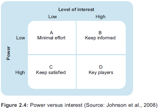Quadrant C - the ‘keep satisfied’ group who have low interest but high power. They may appear passive but the level of interest can change suddenly, moving them to quadrant D - key players.
