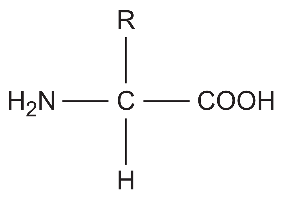 where NH2 represents an amine group, COOH represents a carboxyl group and R represents a side chain. The twenty amino acids that are common in all organisms differ only in their side group.