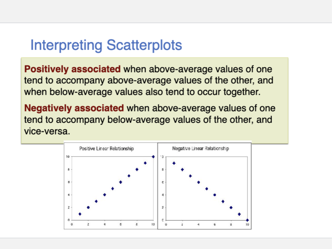 how do we interpret scatterplots? explain negative and positive association