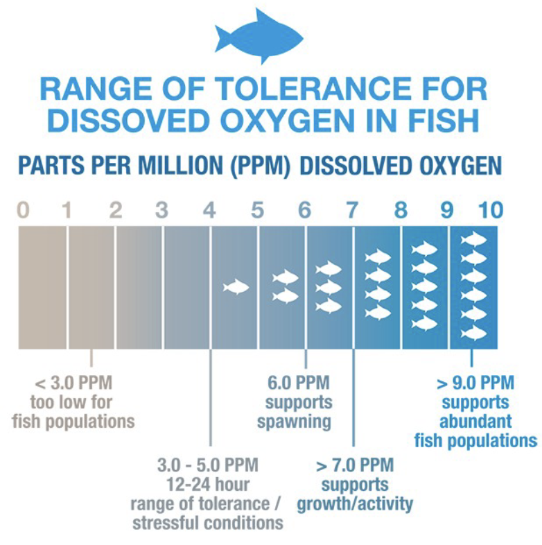 Range of tolerance for dissolved oxygen in fish