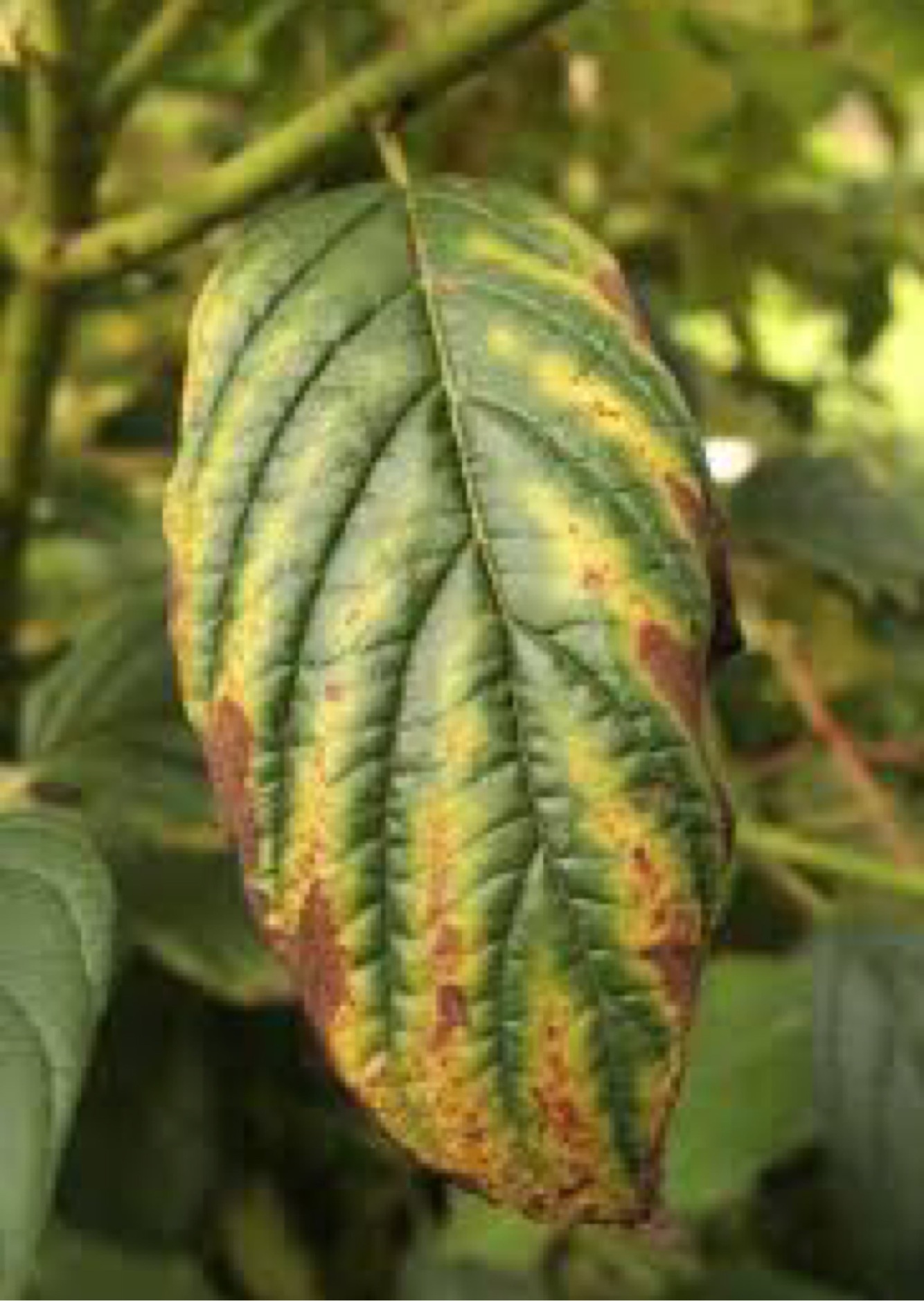 Intervenal chlorosis caused by Nitrogen deficiency